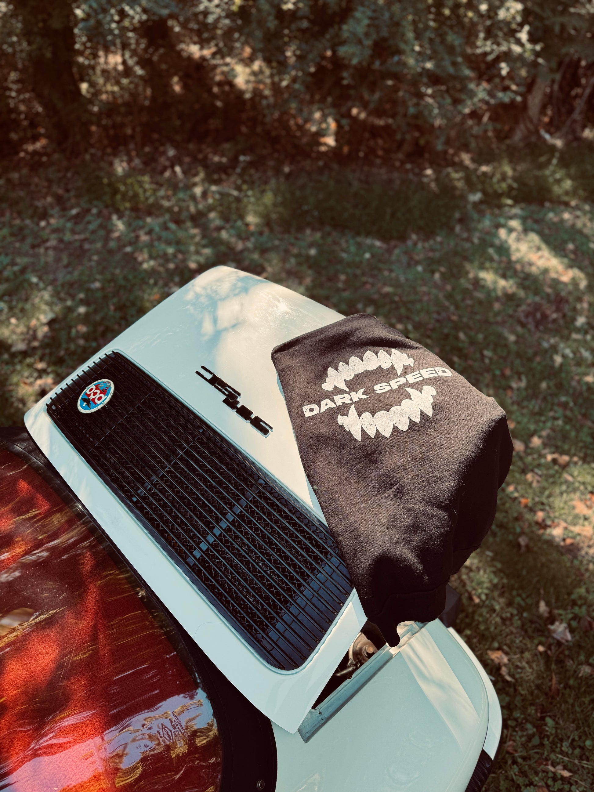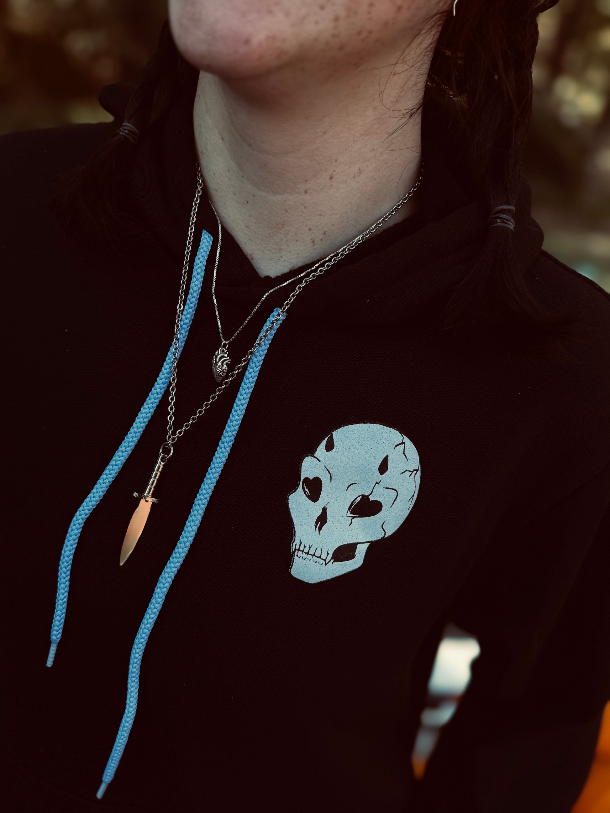 This is our Dare To Deviate hoodie featuring distressed vampire teeth, a sleeve quote, and our iconic skull logo on the front. This hoodie is perfect for fall / spooky season so get yours now!